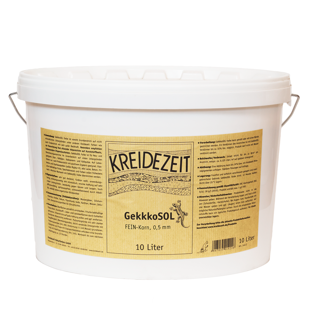 GekkkoSOL FEIN-Korn ist eine rein mineralische Haftbrücke für andere KREIDEZEIT Farben wie auch Endanstrich und Lasurgrund mit feiner Körnung (0,5 mm).