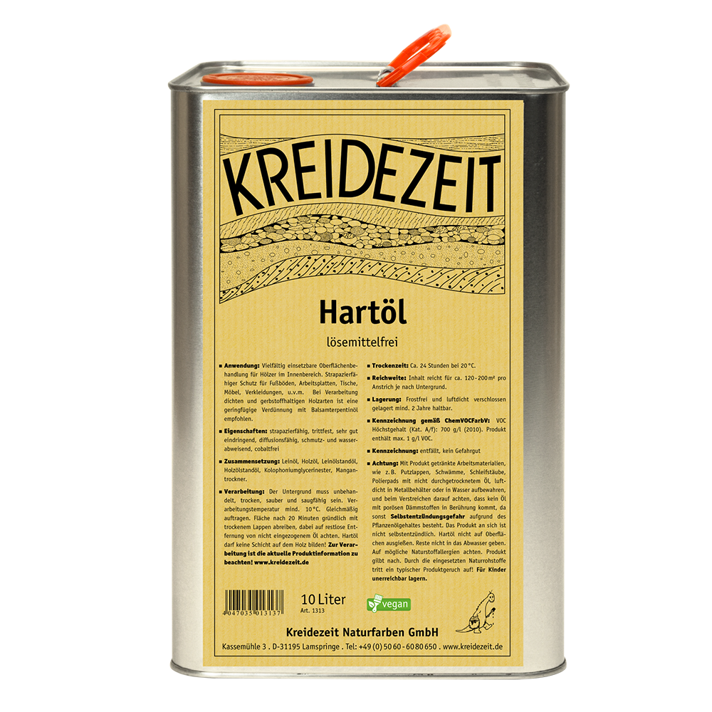 Das Kreidezeit Hartöl ist eine hochkonzentrierte, universelle Oberflächenbehandlung für alle Hölzer im Innenbereich. Als „Pure Solid“ Produkt enthält es weder Lösemittel noch Wasser und besteht zu 100 % aus wertvollen natürlichen Ölen und Harzen. Ob für Fussböden, Küchenarbeitsplatten oder Möbel – dieses Hartöl dringt tief in das Holz ein und erzeugt eine extrem strapazierfähige, schmutz- und wasserabweisende Oberfläche, die das Holz atmen lässt und seine natürliche Schönheit betont.